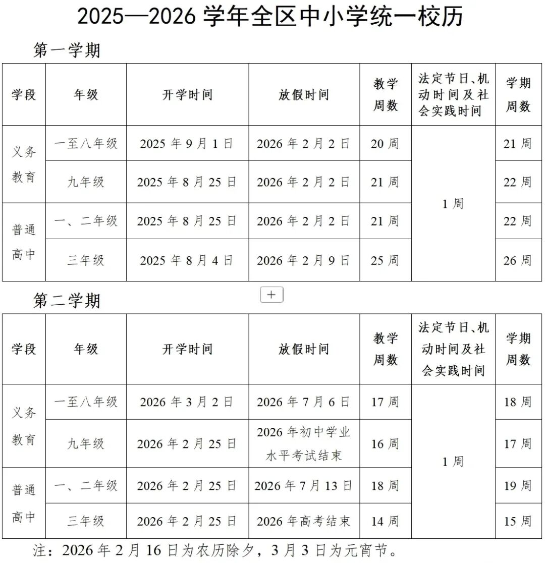 2025-2026学年,南宁中小学生统一校历来了!春季学期才14-17周!2026年2月